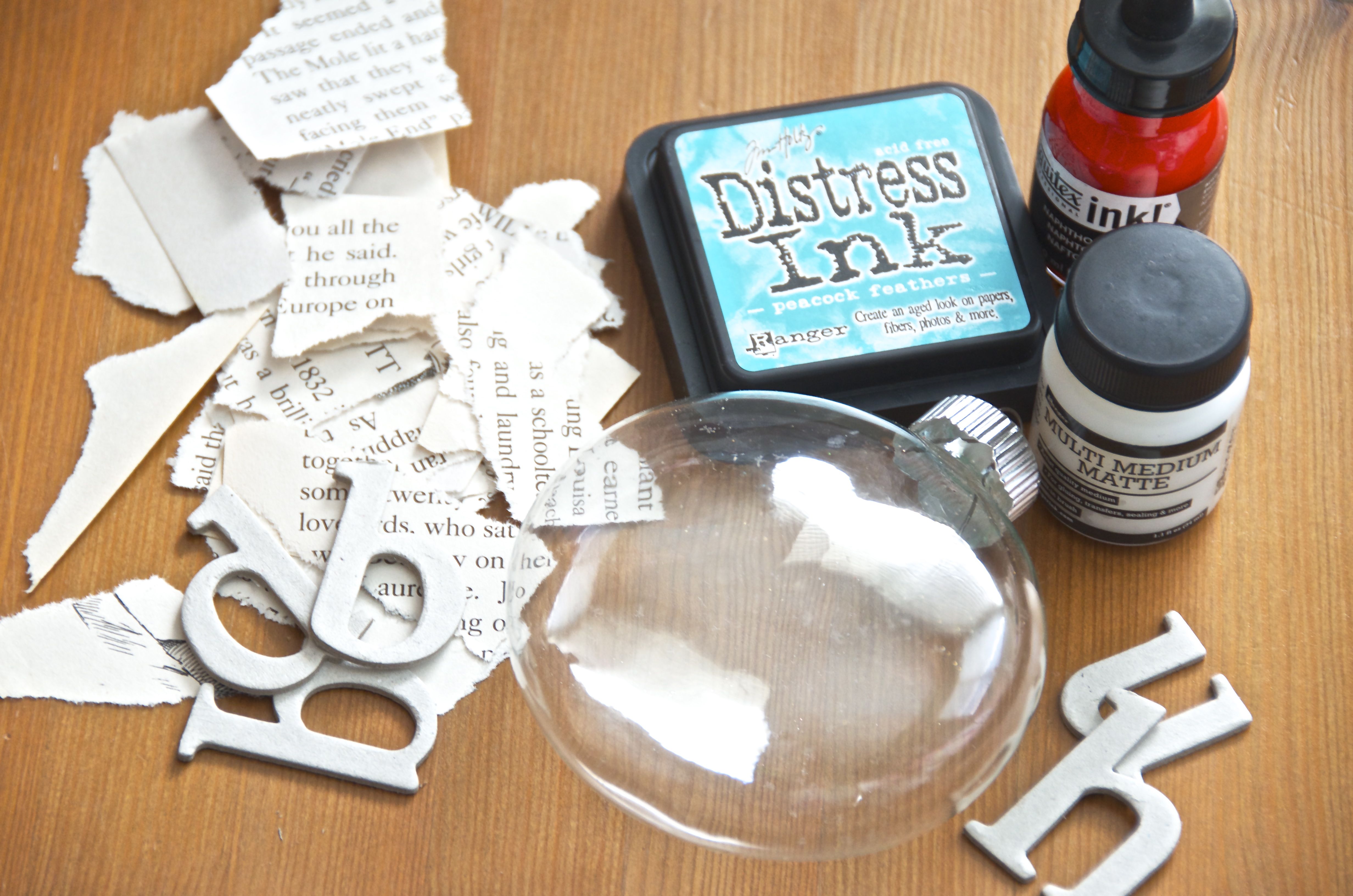 Let’s get started, you’ll need a clear plastic or glass ornament, an old book, some modge podge, some plain white copy paper, red ink, and a contrasting color ink(I chose turquoise because, well, it’s kinda my thing: red + turquoise= happiness). As options, you can grab some chipboard letters and hemp, jute, ribbon, or raffia. All these items are available at any craft store and if you don’t have book at home that you’re comfortable tearing the pages out of, they’re available for under a dollar at any thrift store.